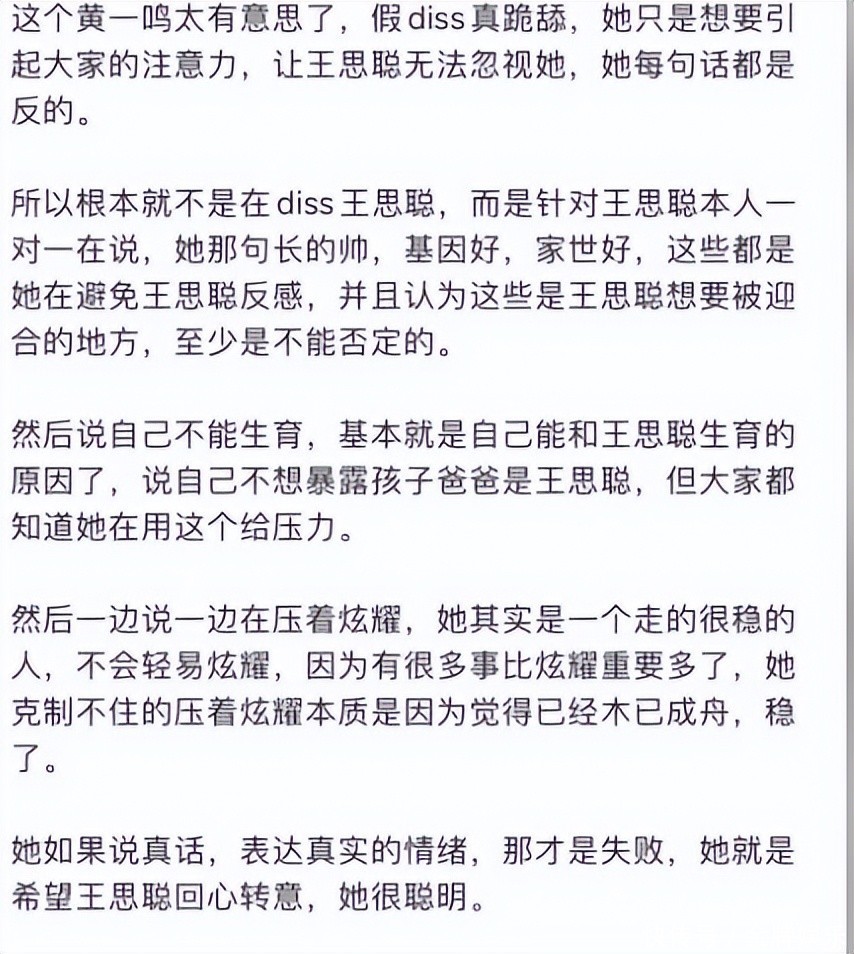 有些东说念主说黄一鸣傻,但她是最智谋阿谁,也许背后有东说念主给她出策画策。——要是她跟王念念聪要钱成功,那以后就可以靠着孩子吃香喝辣,无谓去得益营生。要是王念念聪不认,那她咫尺带货的流量一下就上去了,她眼里王念念聪便是一个大流量。
